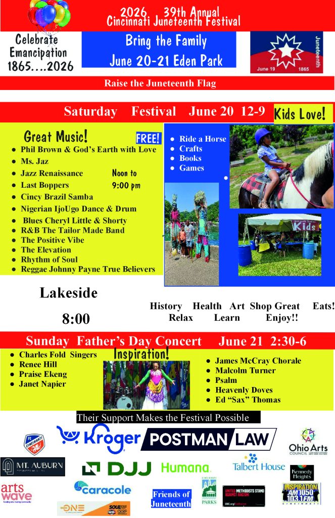 On June 8, 2025, join Juneteenth Cincinnati in recognizing the significant role of water in the 400-year history of African enslavement and the quest for freedom with a symbolic dance to acknowledge the role water has played in “enslavement” and “freedom” in the America’s. We will all wear white with an accent of color if we choose (sash, a scarf, jewelry, etc.).